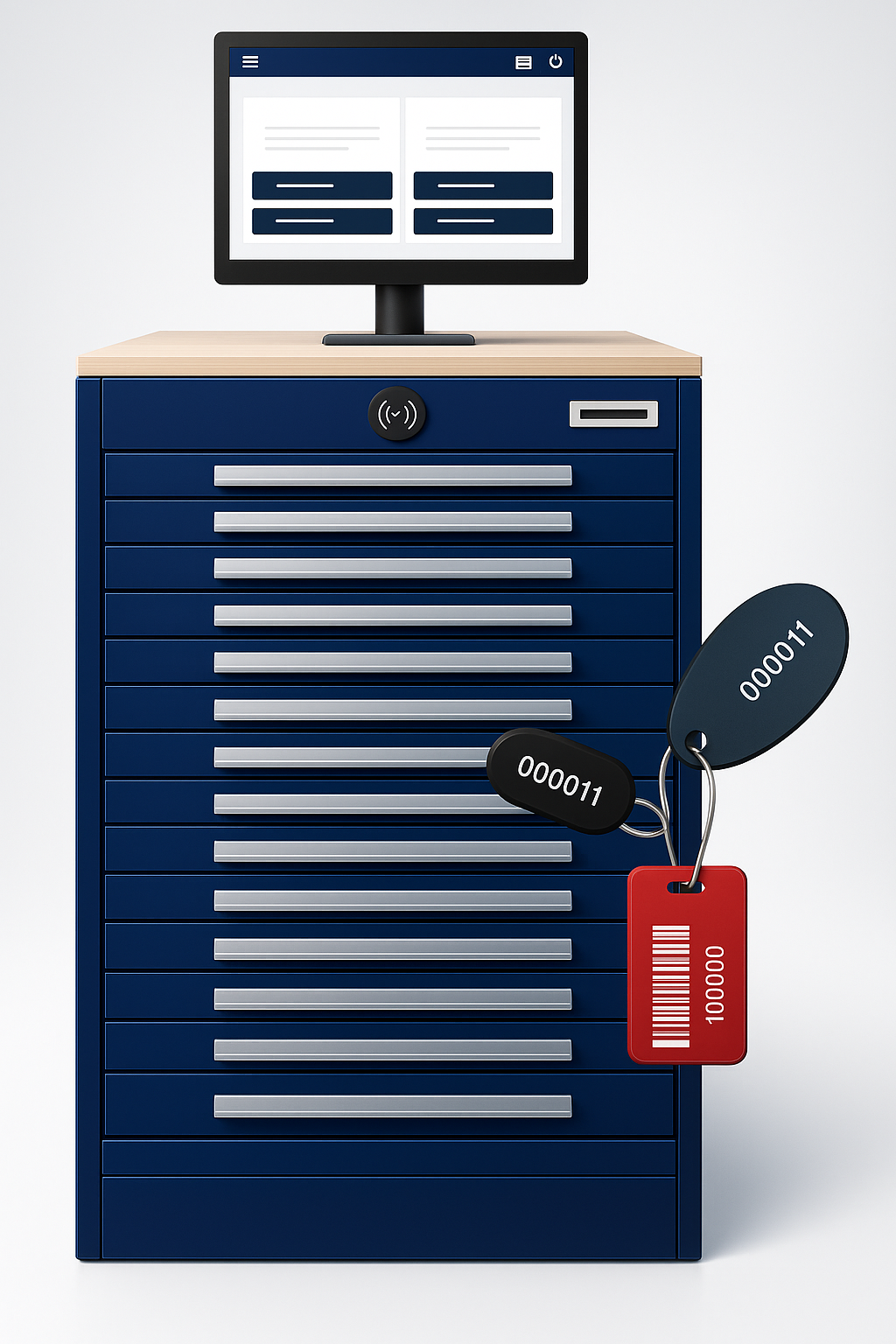 Ein automatisches Schlüsselausgabesystem besteht in der Regel aus einem robusten Schlüsselschrank, elektronischen Verriegelungen, Identifikationseinheiten wie RFID- oder Chipkartenlesern sowie einer zentralen Steuer- und Verwaltungssoftware. Je nach Ausführung sind auch Touch-Displays, PIN-Pads und Netzwerkmodule für die Anbindung enthalten.